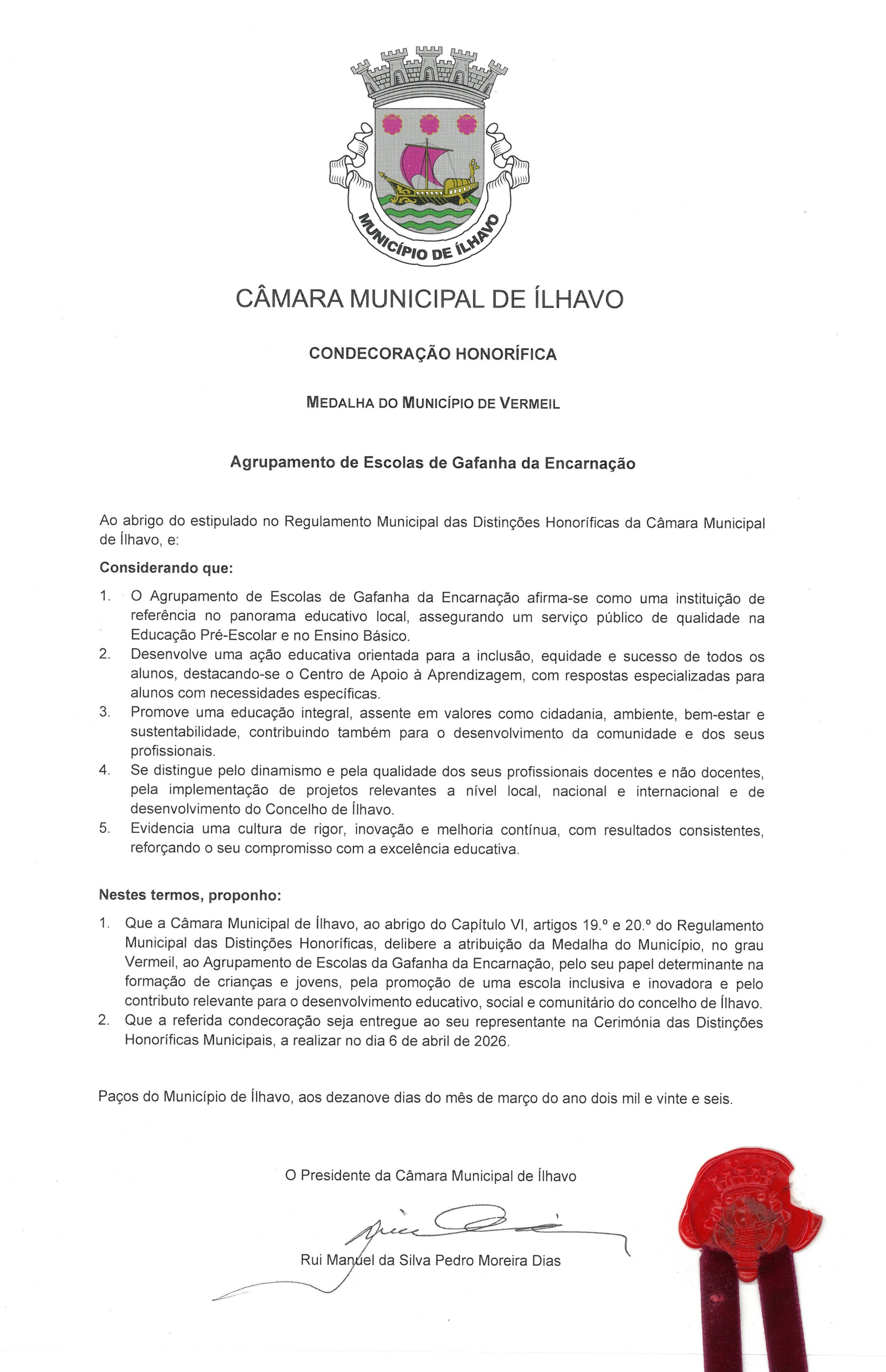 O Agrupamento recebeu uma condecoração honorífica atribuída pela Câmara Municipal de Ílhavo. Foi-lhe atribuída a Medalha do Município grau de Vermeil.