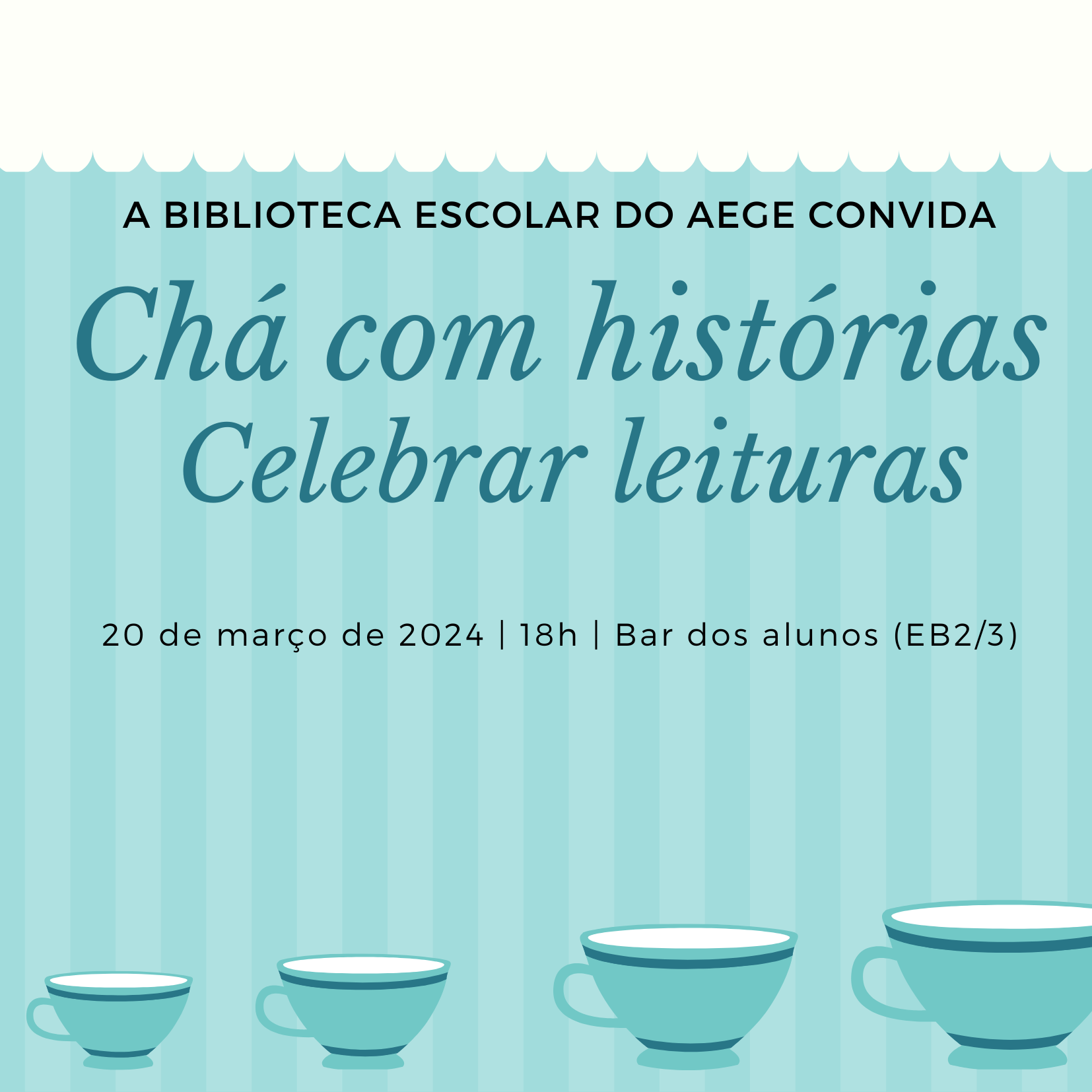 É já na quarta feira da próxima semana que vamos ter mais um Chá com histórias. Será no dia 20 de março, a decorrer a Semana da Leitura, às 18h, no nosso Bar de alunos.