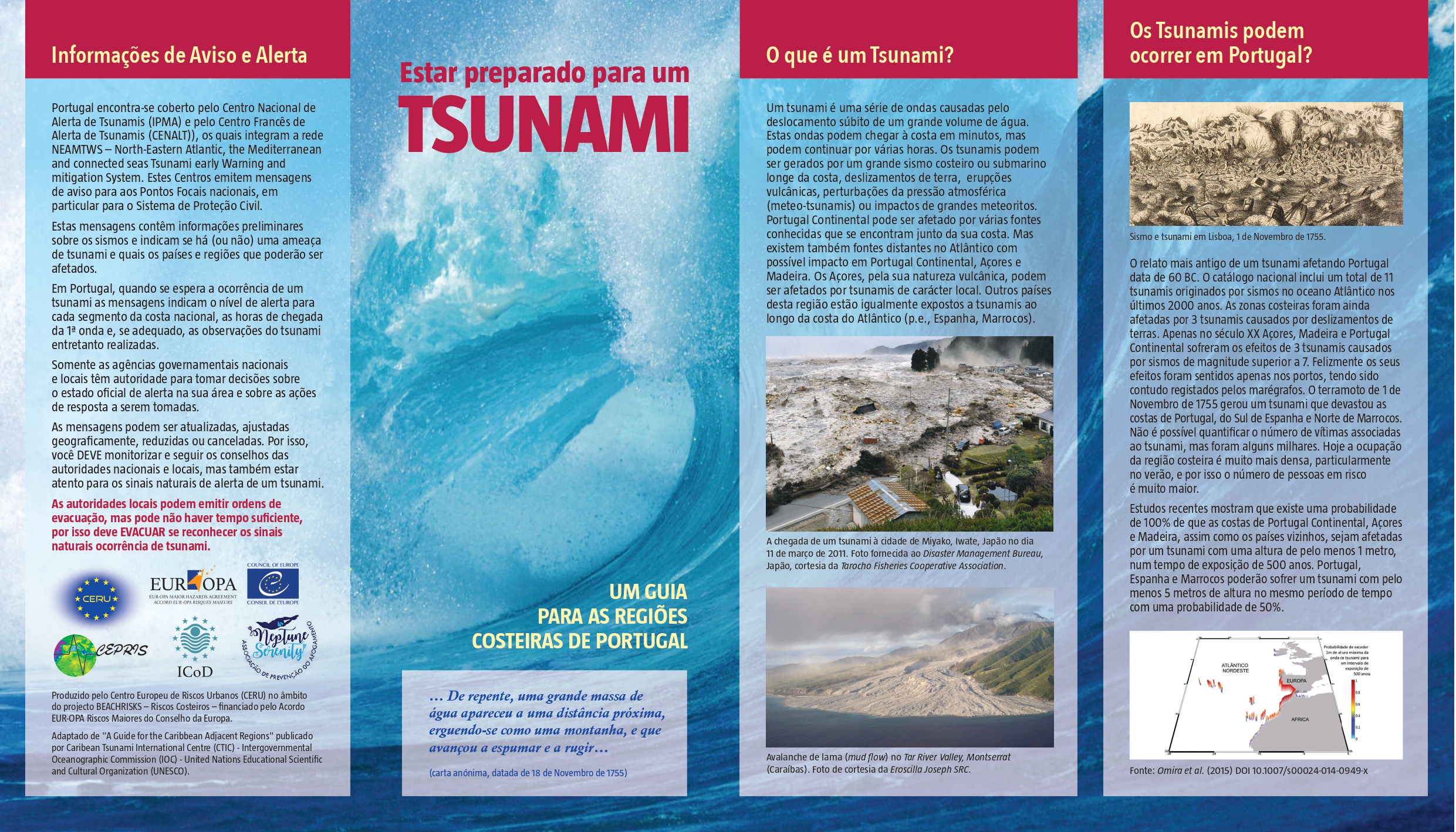 "Um tsunami é uma série de ondas causadas pelo deslocamento súbito de um grande volume de água. Estas ondas podem chegar à costa em minutos e... continuar por várias horas!